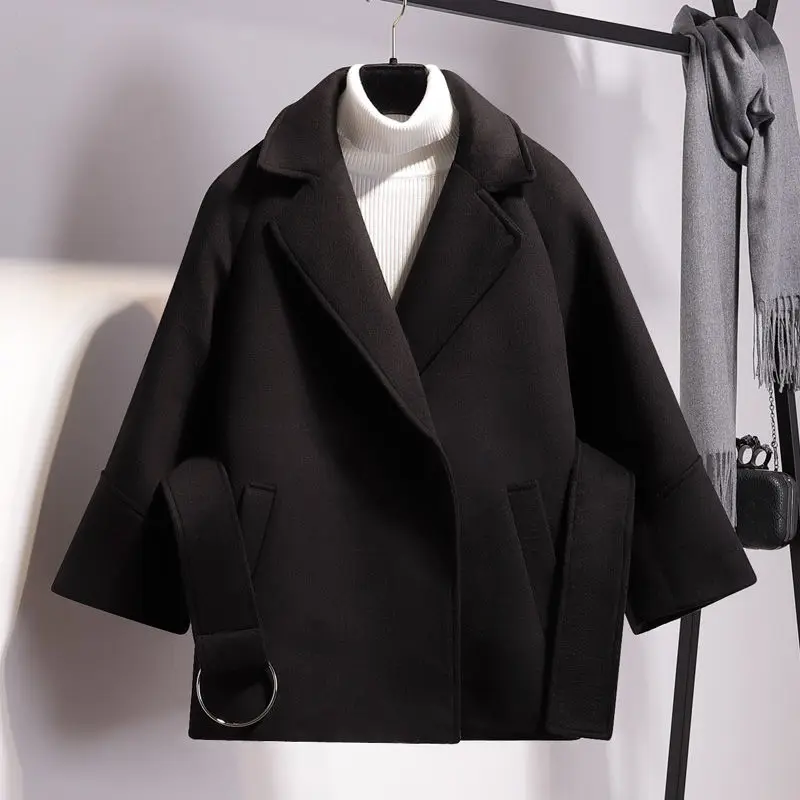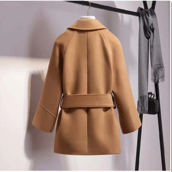 Fashion Women Short Woolen Coat Belt Jacket Autumn Winter Woolen Coat Slim Outwear Windbreaker